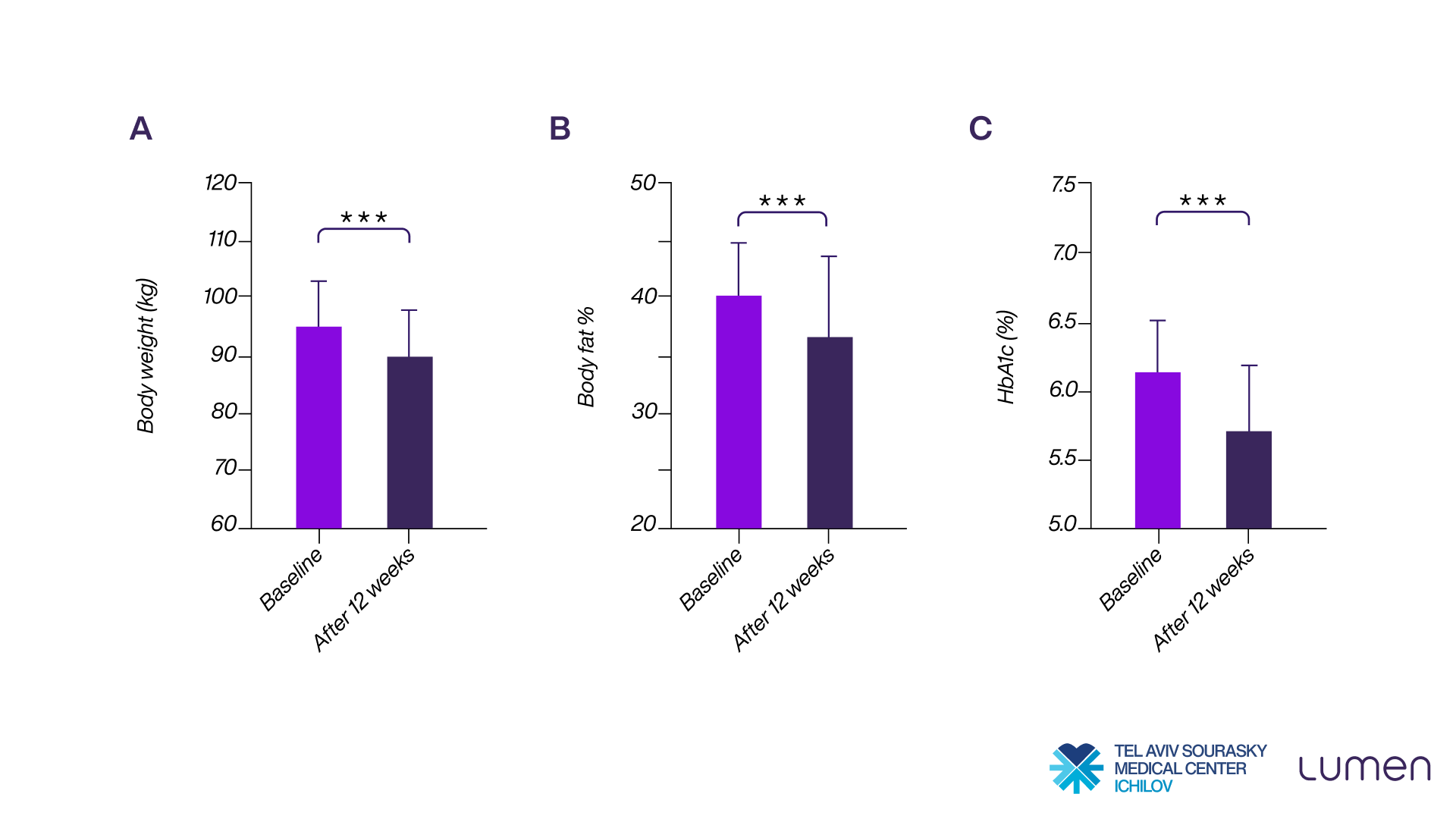 In a peer-reviewed clinical study published in PubMed (7), Lumen's research team together with Tel Aviv Sourasky Medical Center found that participants who used Lumen’s recommendations for 12 weeks saw improved metabolic parameters. Participants achieved an average weight loss of 6% (13 pounds) and significant reductions in body fat and waist circumference.